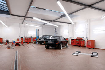 Für einen fester Kundenkreis mit exclusiven Fahrzeugen ist die Werkstatt im Stuttgarter Westen Anlaufpunkt bei großen und kleinen Problemen. Die Architektur des Hauses mit einer alten Werkhalle bietet beste Voraussetzungen für ein kreatives und sauberes Arbeiten. Die neu gestalteten, hellen, lichten Räume sind ausgestattet mit Hebebühnen, einer Rahmenrichtbank mit viel Zubehör und weiterer Spezialausrüstung für den Karosseriebau. Für englische und amerikanische Fahrzeuge sind Werkzeuge in Zoll-Ausführung vorhanden. Nicht nur viele alte „Engländer“ werden hier auf Vordermann gebracht, sondern auch schöne, hochwertige Oldtimer auf Rennen vorbereitet. Die saubere Fahrwerkeinstellung aller dafür relevanten Komponenten gehört für Rolf Mayer zum Tagesgeschäft.